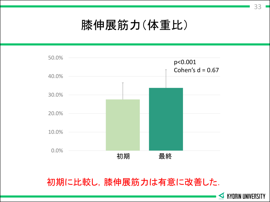 「はつらつ体操井の頭」のトレーニングの内容は自重負荷での筋力増強練習、ストレッチング、エクササイズバンドによるレジスタンストレーニングなど。毎回60分、そのような体操を行い、30分のミニ講座が組み合わされます。このプログラムを3ヵ月続けた結果、膝伸展筋力などの各測定値の平均値は有意に改善しました。