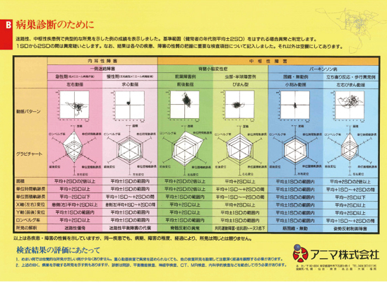 からだのふらつきや、めまい・平衡障害のスクリーニングに適しています。日本人の健常値データーを内蔵し、ニューラルネット(人工知能)解析技術によって、「健常」・「異常」の程度を自動識別します。またラバー負荷検査により末梢前庭障害の有無を簡単にスクリーニングすることができ、上位機種では、「迷路障害」・「中枢障害」の自動識別が出来ます。臨床において、めまい・平衡障害の検査に利用されるほか、リハビリテーション医学、歯科、スポーツ医学、体育など、広い分野で平衡機能の評価に利用されています。