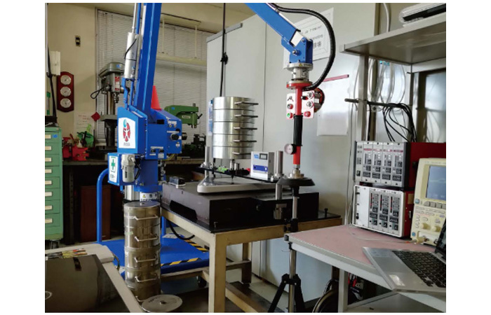 JIS規格で定める分銅を載荷しています。分銅は計量法に基づく特定標準器(国家基準)にトレーサブルな標準器により校正されたものです。