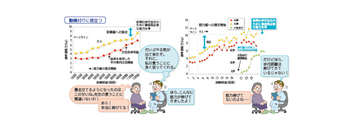 たとえば、筋力を測ることで、虚弱高齢者や脳卒中片麻痺患者における歩行・動作自立状態の判定が出来る筋力トレーニングの必要性の判断、トレーニングの計画・設計、動作障害の原因分析ができ、その情報をスタッフ間や対象者、その家族へのinformed consent に利用できます。また、対象者のトレーニングに対する動機づけにも有効活用できます。