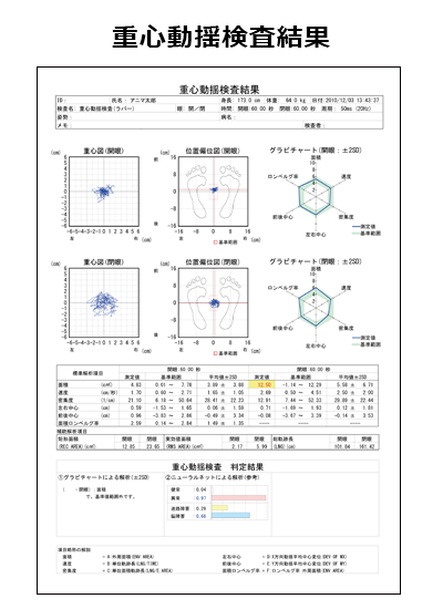 1. 重心動揺軌跡 2. 総軌跡長(重心動揺距離) 3. 単位軌跡長(速度) 4. 単位面積軌跡長(密集度) 5. 外周面積 6. 矩形面積 7. 実効値面積 8. 動揺平均中心変位 9. 動揺中心変位 10. ロングベル率(前記2〜7項目の閉眼値/開眼値)