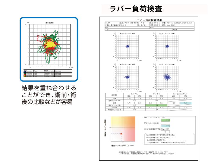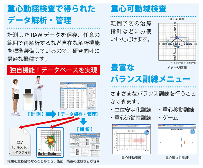 からだのふらつきや、めまい・平衡障害のスクリーニングに適しています。日本人の健常値データーを内蔵し、ニューラルネット解析技術によって、「健常」・「異常」の程度を自動識別します。またラバー負荷検査により末梢前庭障害の有無を簡単にスクリーニングすることができ、パワーベクトル検査(オプション)によって中枢性機能障害の識別ができます。データの保存、CSV出力などを可能とし研究分野でもお使いいただけます。
