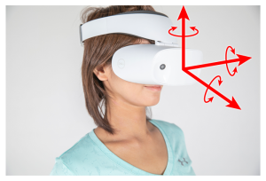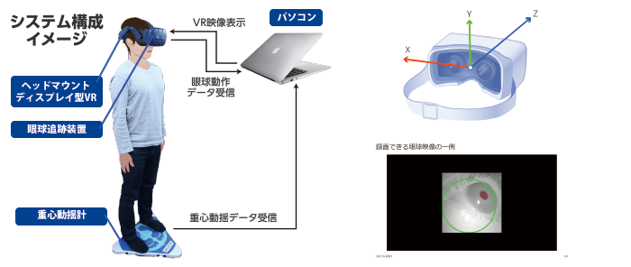 VRゴーグルによる仮想空間上で視覚刺激を与えることができます。重心動揺計と組み合わせることで、刺激の有無による重心動揺の各種パラメータを比較し、ロンベルグ率と動揺の比率として評価できます。