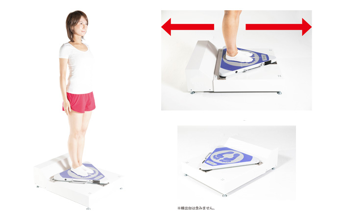 重心動揺計(検出台)を載せ、水平移動させる装置です。被験者に水平刺激を与えて重心動揺検査を行ったり、水平刺激に対するバランス訓練を行う装置です。