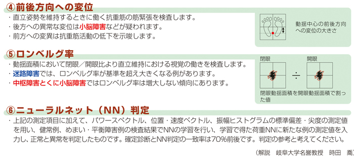 重心動揺検査では、平衡維持に関与する内耳系、中枢疾患系、脊髄反射系の機能検査をするとともに、これらの部位障害の原因となる因子、例えば、動脈硬化、糖尿病、脳白質障害の早期発見を目的としています。