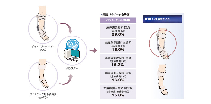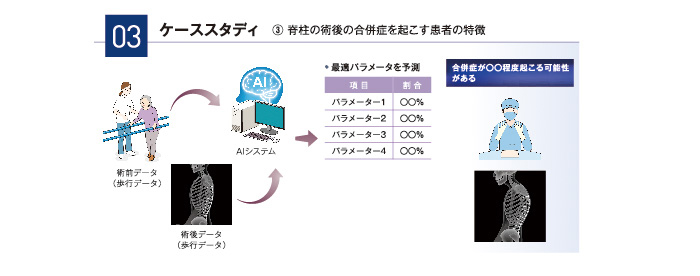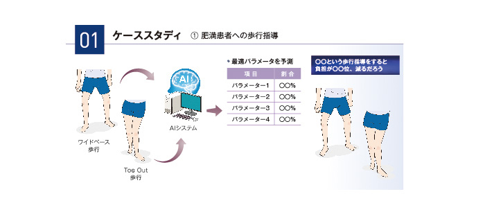 アニマでは、人工知能(AI)技術を用いたリハビリテーション評価の臨床応用に関する研究開発を行っています。この技術を使うことで、治療方針決定のために有効なパラメーターを動作分析データの中から選び出し、どのような治療方法を目の前の患者さんに選択するべきかという情報を得ることができます。これによって、人間をサポートする知的システム(IA:知能増幅器(Intelligence Amplifier))を構築することを目標としています。