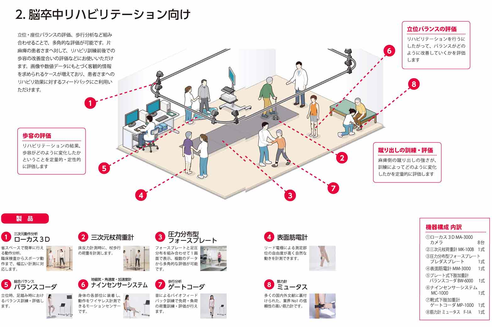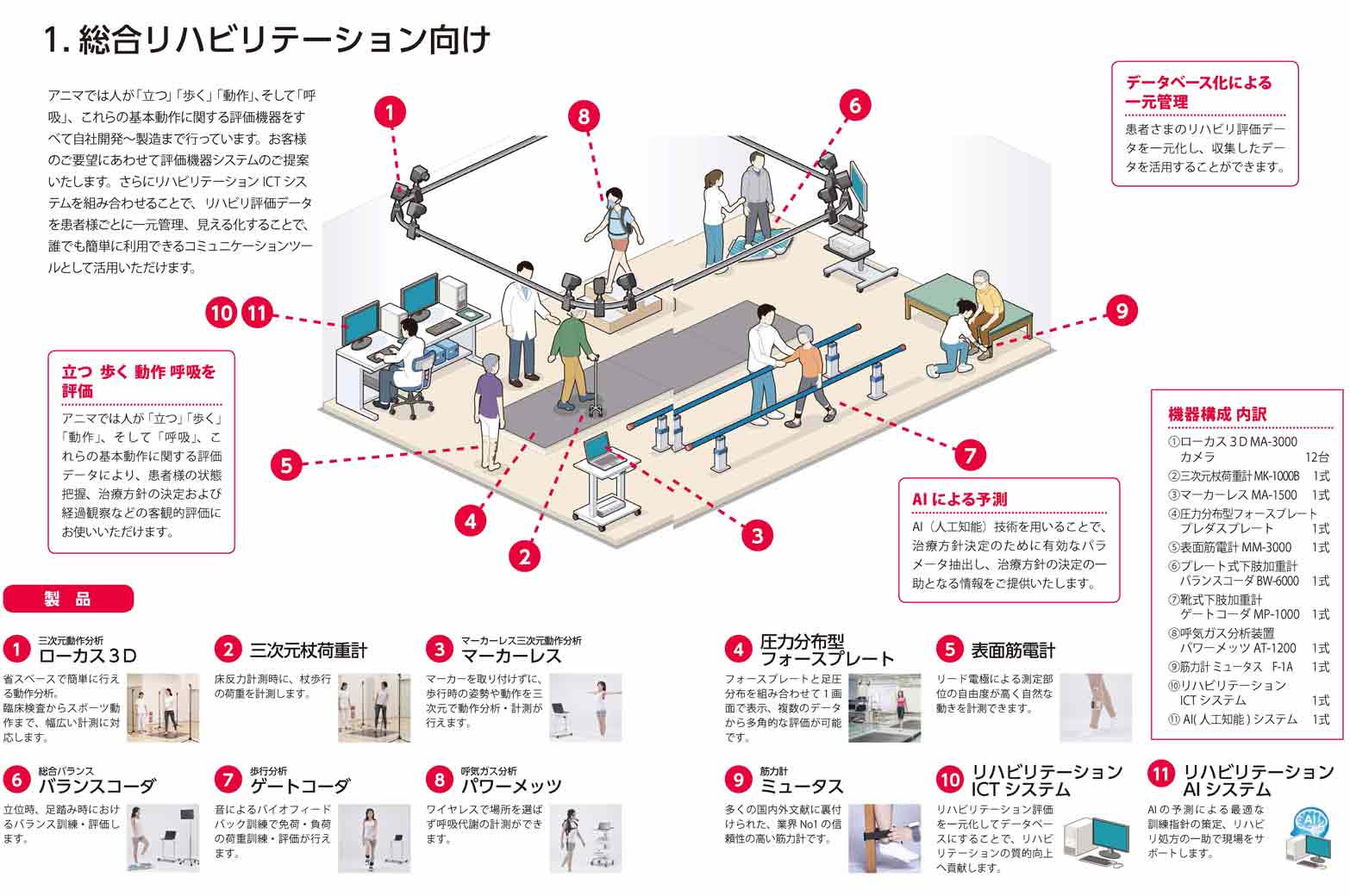 アニマでは人が「立つ」「歩く」「動作」、そして「呼吸」、これらの基本動作に関する評価機器をすべて自社開発~製造まで行っています。お客様のご要望にあわせて評価機器システムのご提案いたします。さらにリハビリテーションICTシステムを組み合わせることで、リハビリ評価データを患者様ごとに一元管理、見える化することで、誰でも簡単に利用できるコミュニケーションツールとして活用いただけます。