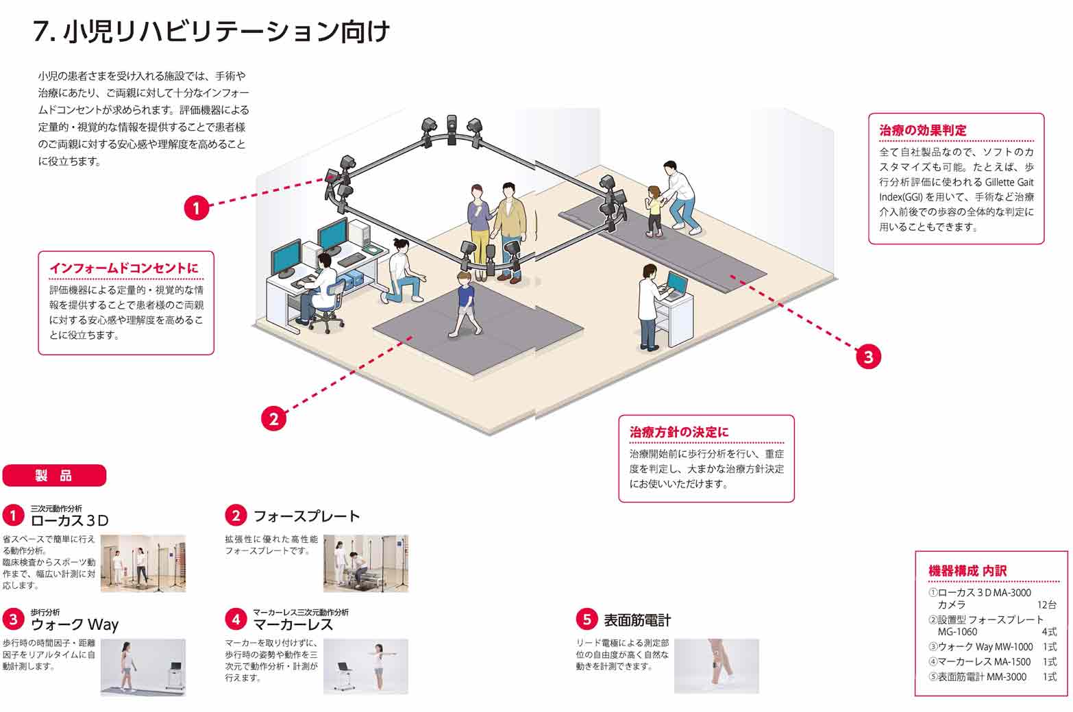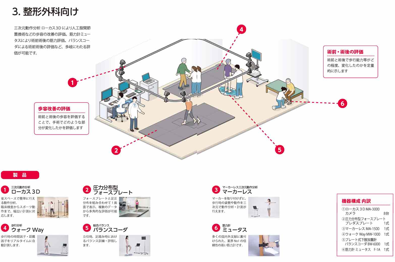 三次元動作分析 ローカス3Dにより人工股関節置換術などの歩容の改善の評価、筋力計ミュータスにより術前術後の筋力評価、バランスコーダによる術前術後の評価など、多岐にわたる評価が可能です。