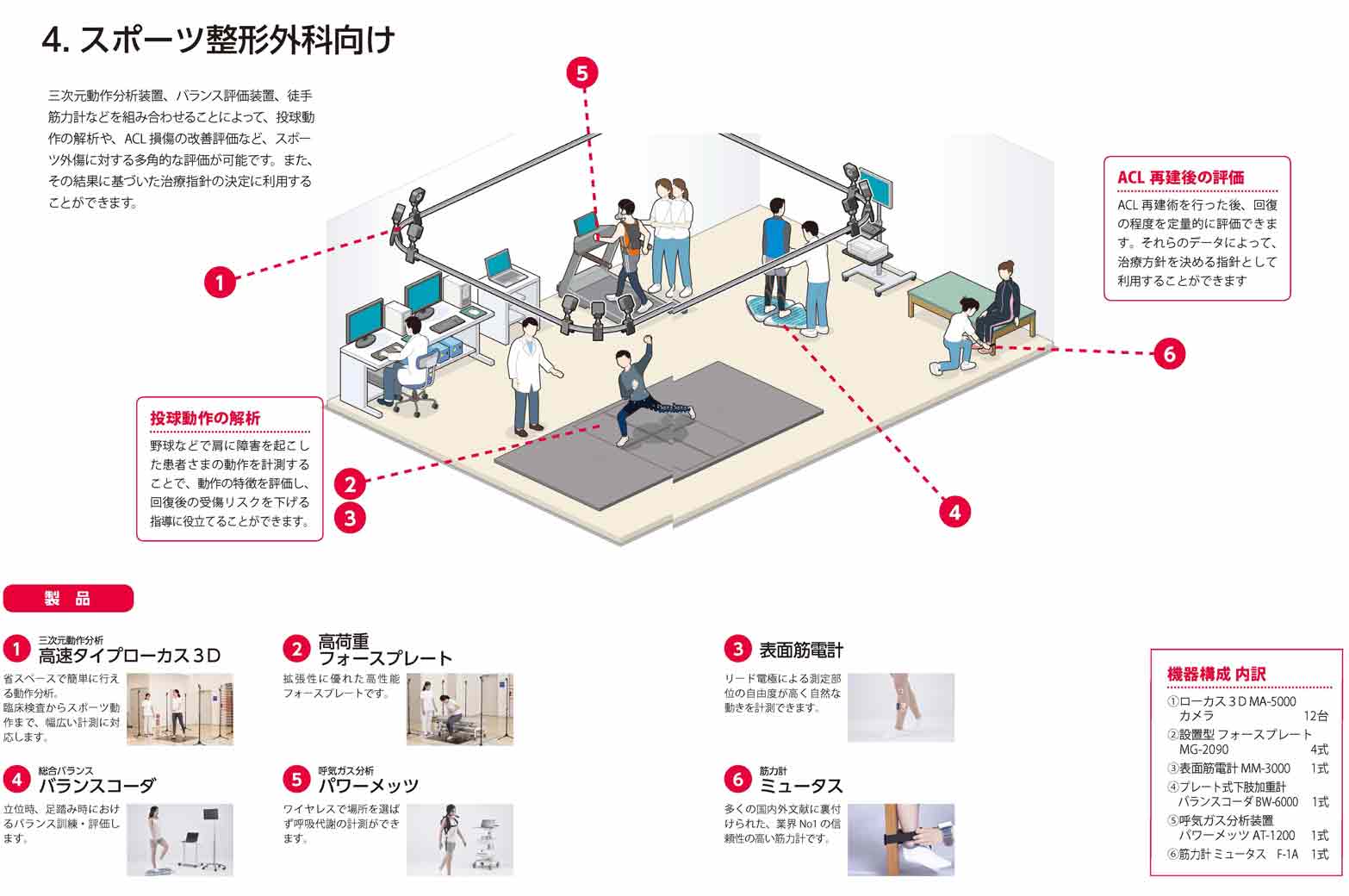 三次元動作分析装置、バランス評価装置、徒手筋力計などを組み合わせることによって、投球動作の解析や、ACL損傷の改善評価など、スポーツ外傷に対する多角的な評価が可能です。また、その結果に基づいた治療指針の決定に利用することができます。