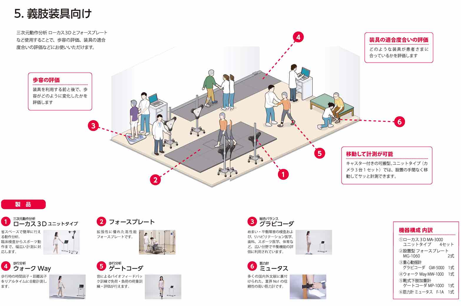 三次元動作分析 ローカス3Dとフォースプレートなど使用することで、歩容の評価、装具の適合度合いの評価などにお使いいただけます。