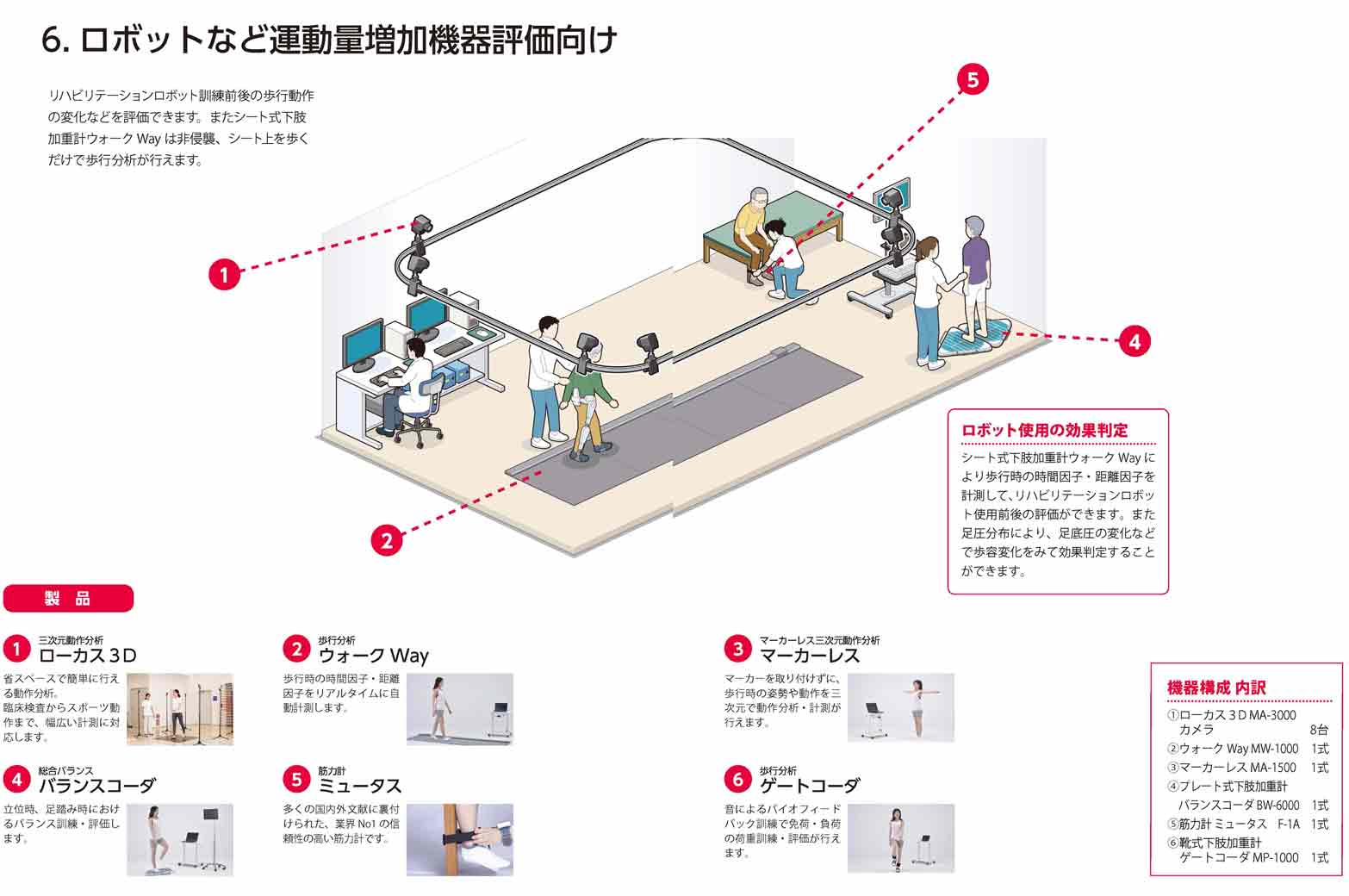 リハビリテーションロボット訓練前後の歩行動作の変化などを評価できます。またシート式下肢加重計ウォークWayは非侵襲、シート上を歩くだけで歩行分析が行えます。